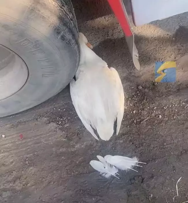 司機聞言下車查看,結果發現鴨子的屍體完好無損並無輾壓痕跡,看上去不像是被重達50噸貨車輾過的樣子,懷疑是大媽自導自演,遂拿出手機錄影蒐證,並通知警方到場處理。