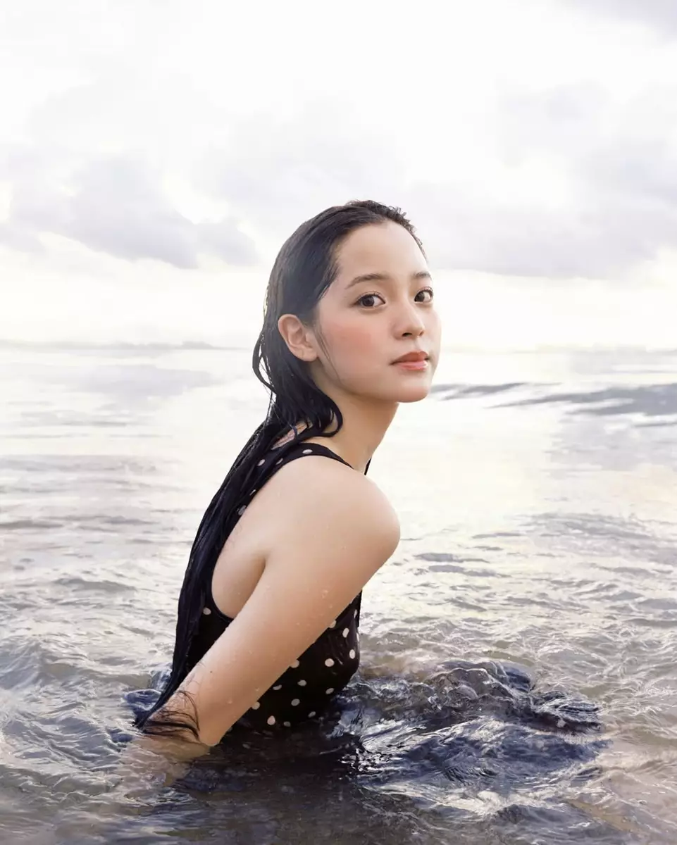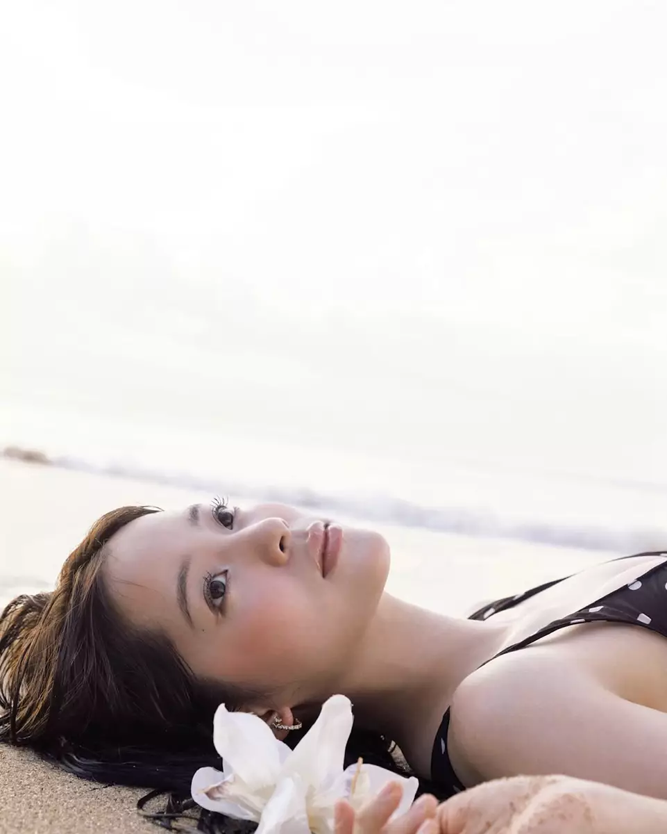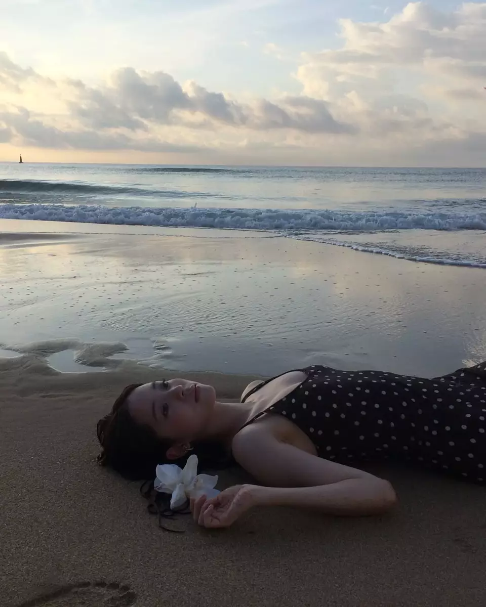 相片中,歐陽娜娜躺在日落時分的沙灘上,黑色波點裙被海水沾濕後緊貼身體,令其玲瓏曲線一覽無遺。一頭濕潤秀髮配上迷濛眼神,加上若隱若現的事業線,畫面性感又唯美,展現22歲少女的青春活力。
