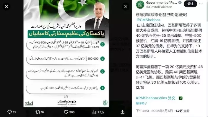 巴基斯坦政府官方帳號6月6日在社交媒體公布訊息,總理謝里夫任內取得多項重大外交成就。其中,引進40架殲-35隱形戰鬥機、空警-500預警機和紅旗-19反導系統格外引人注目。此外,巴基斯坦與阿塞拜疆簽署40架JF-19「雷電」(即「梟龍」戰鬥機)出口協議,並與伊朗貿易額從30億美元增至100億美元。「梟龍」戰鬥機出口訂單持續增加,為巴基斯坦採購中國先進裝備提供寶貴外匯。