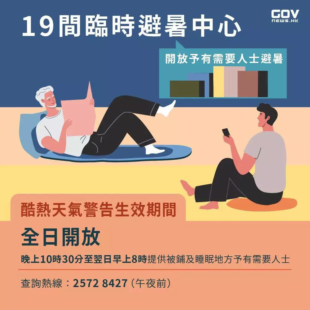 臨時避暑中心會在酷熱天氣警告生效期間全日開放予市民避暑。在晩上10時30分至翌晨8時,臨時避暑中心亦供應被鋪及睡覺的地方予有需要人士。中心內有人員當值。