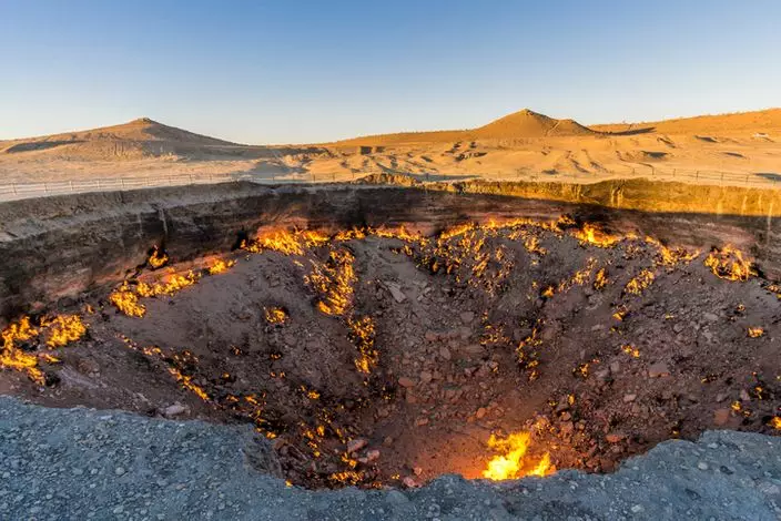 「地獄之門」(Door to Hell) 是中亞內陸國家土庫曼一個充滿天然氣的巨型坑洞,內有烈火已燃燒超過半世紀,但火焰近日大幅減弱,可能快將熄滅。