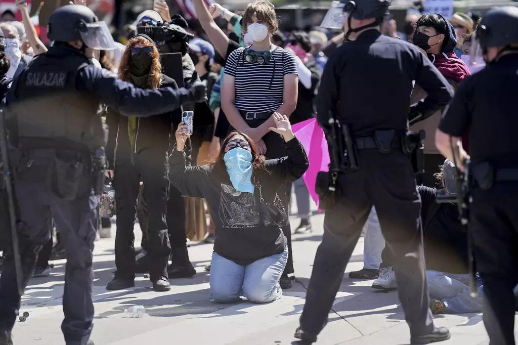 日前示威者在洛杉磯市中心與警察對峙。AP圖片