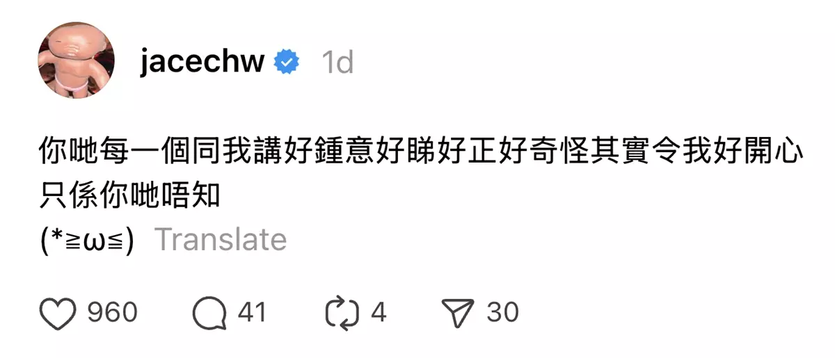 對於網上紛擾的評論,JACE選擇在個人Threads以強勢態度回應:「你哋每一個同我講好鍾意好睇好正好奇怪其實令我好開心」,展現出對自我創作風格的堅持。