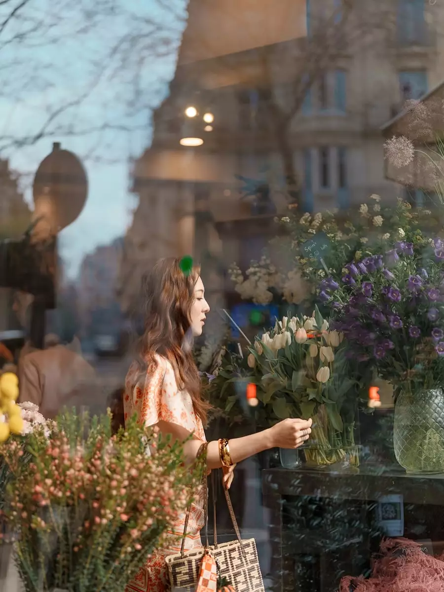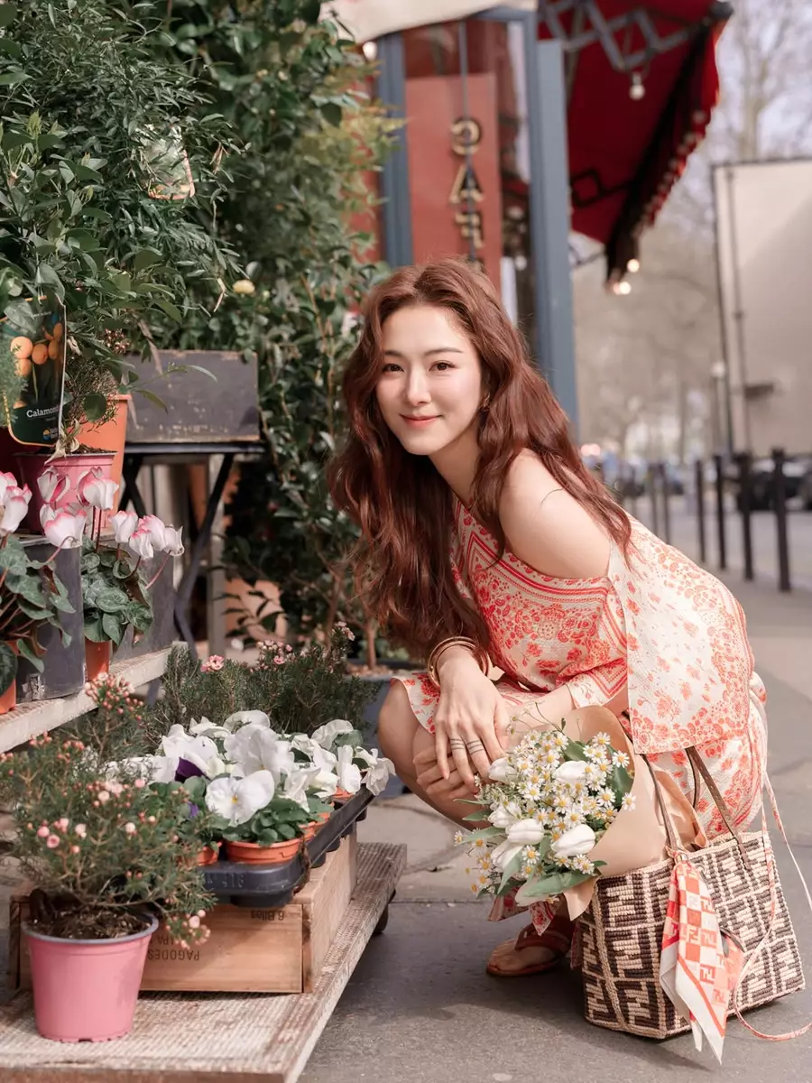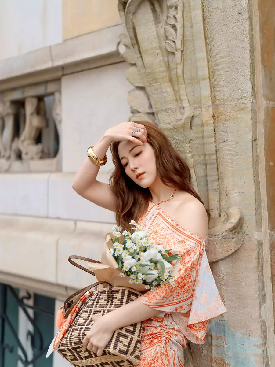 橙白色裙裝與繽紛花海相映成趣
