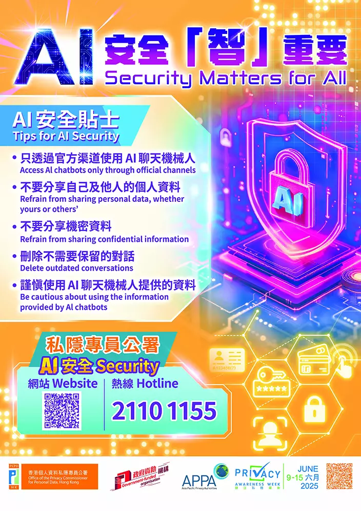 此外,私隱專員公署會向政府部門、各區民政事務處、社區中心、商會等派發「關注私隱週2025」海報,推廣AI安全的重要性。