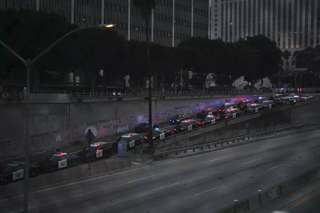 洛杉磯搜捕非法移民觸發的抗議浪潮持續第三日,大批警員到場。AP圖片