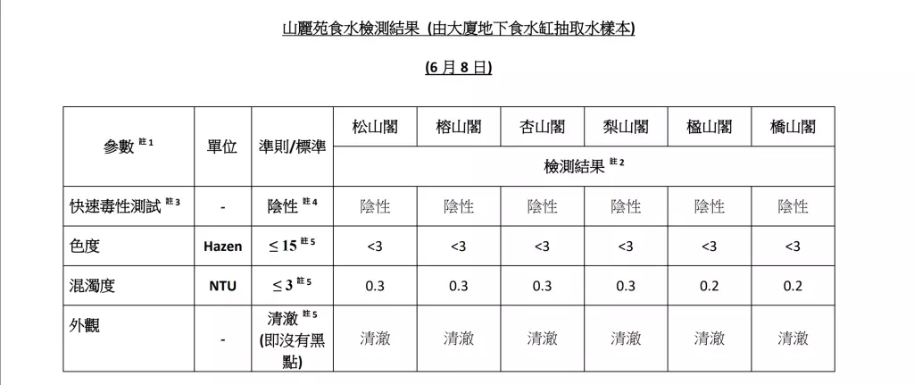 山麗苑5座大廈快速毒性測試呈陰性,水質外觀均為清澈,色度低於3,混濁度低於0.3,符合水務署内部標準。