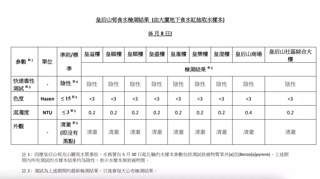 水務署公布星期日(6月8日)粉嶺皇后山邨及山麗苑水質報告,所有測試水樣本結果均為陰性,即水樣本無致癌物質,並符合水務署的内部指引。