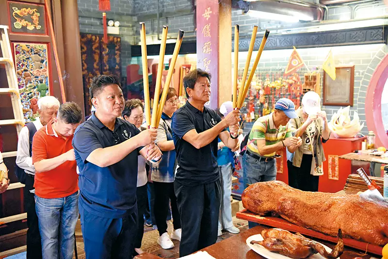 水警總區指揮官吳卓衡(前排左)及水退會主席徐偉雄(前排右)於活動當日到西貢佛堂門天后古廟進行參拜儀式。