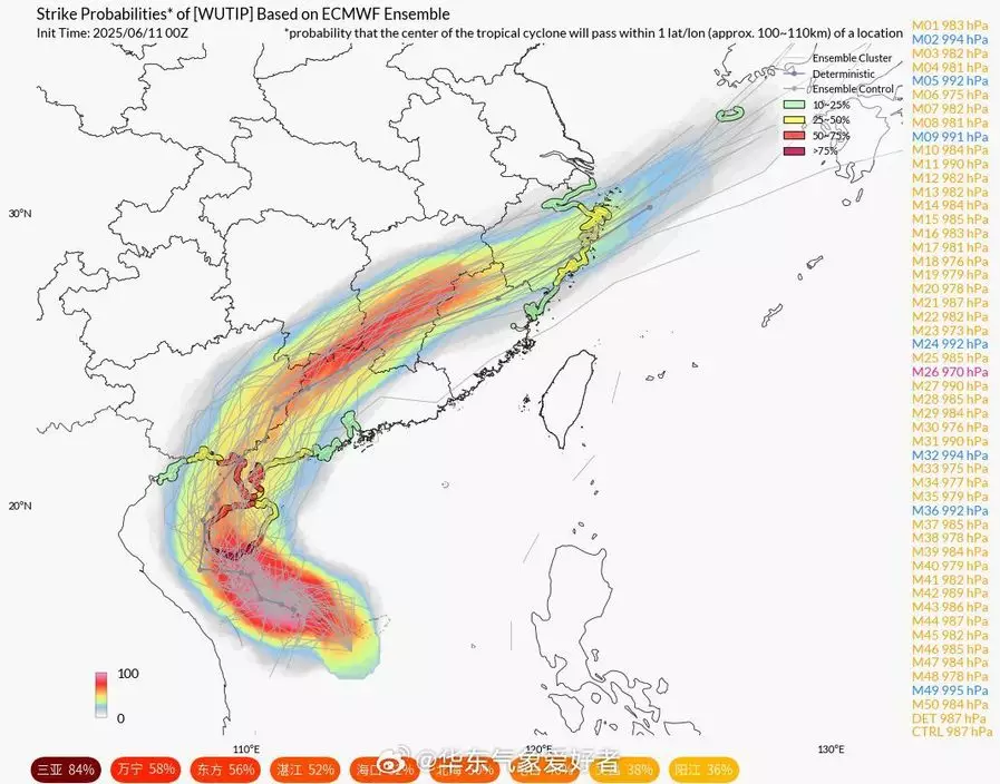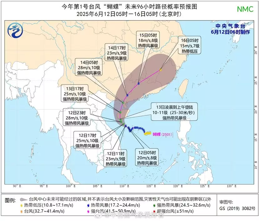 熱帶氣旋蝴蝶可能在星期五(6月13日)凌晨至上午,在海南陵水至樂東一帶沿海登陸。微博圖片