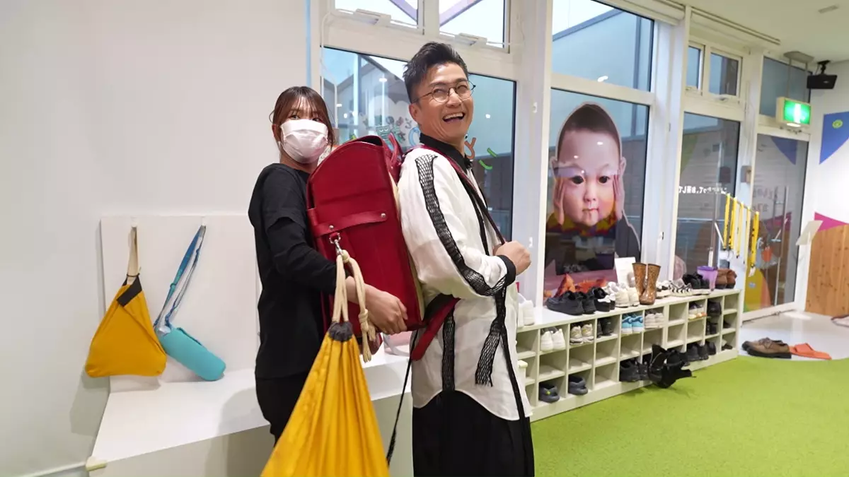 搞笑地試了超大的小朋友書包,特意扮重嚇到女職員。