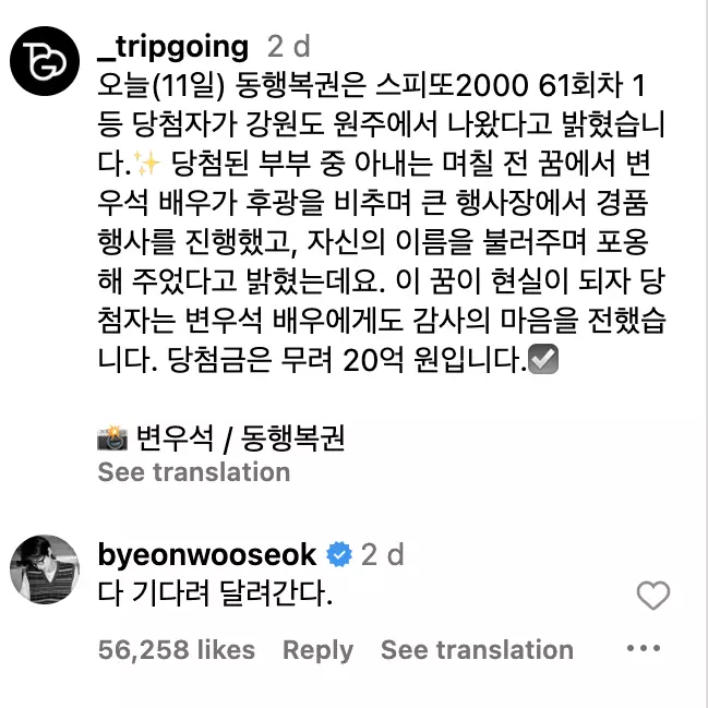 隨後韓國媒體Tripgoing在社交平台上分享了這對夫妻「託邊佑錫之福中頭獎」的消息,吸引大量網友留言表示:「邊佑錫果然是男『神』,請來我夢裡一次吧!」邊佑錫本人也很快注意到了這則報道,並在貼文下幽默留言:「大家等著,我馬上就跑過去!」這一風趣回應讓粉絲直呼「太有趣了」,也向邊佑錫喊話:「請來我夢中送好運!」邊佑錫的親切互動再次令大家感到溫暖。