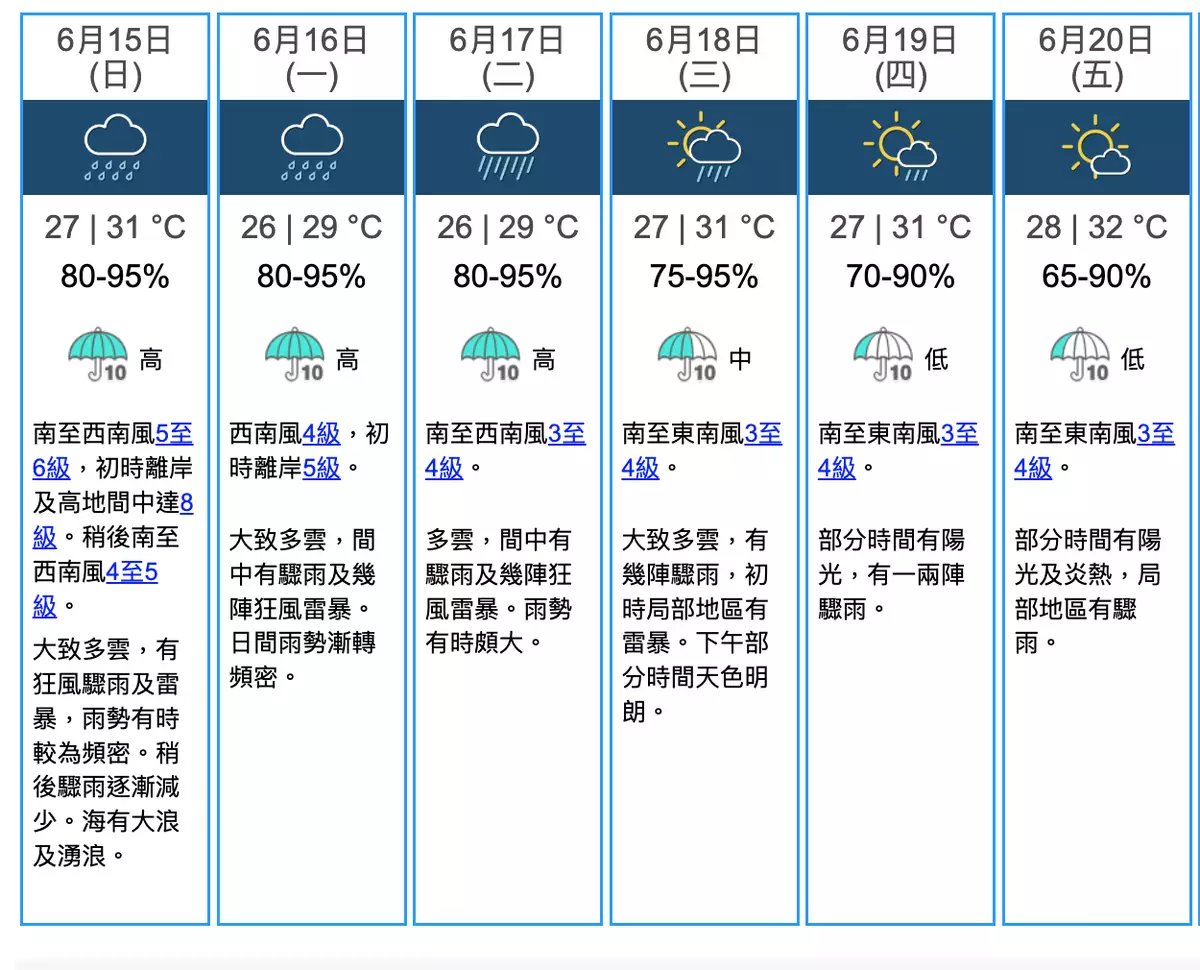 天文台說雖然星期一及星期二蝴蝶已逐漸消散,但活躍西南氣流會為廣東沿岸帶來大驟雨,市民請保持警惕。