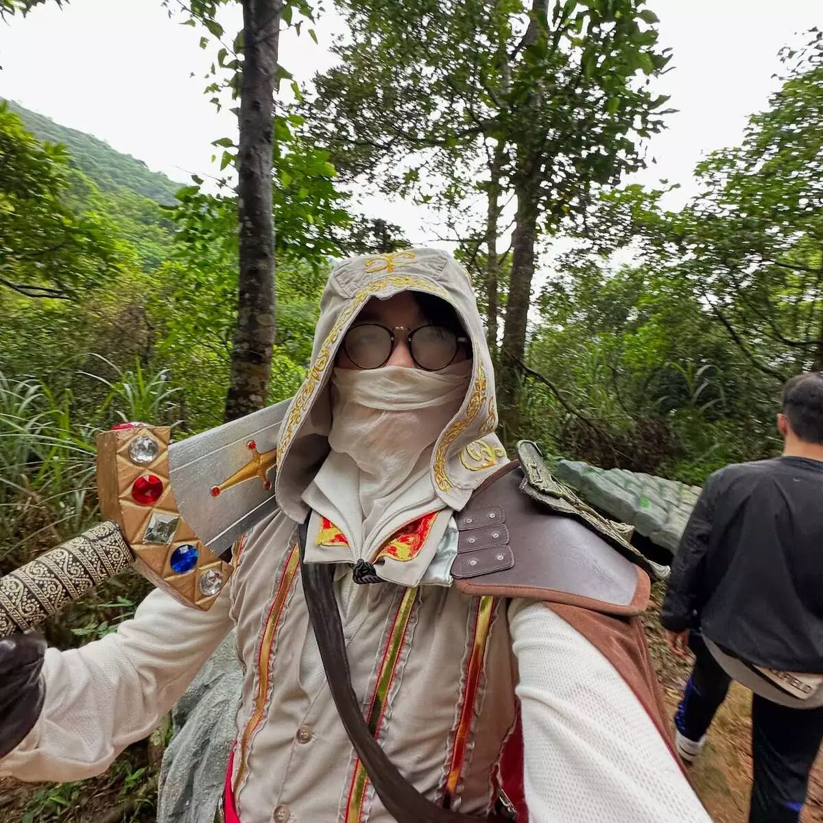 跟住有花俏斗篷式泳衣外搭、配「撞色」朱唇披肩。
