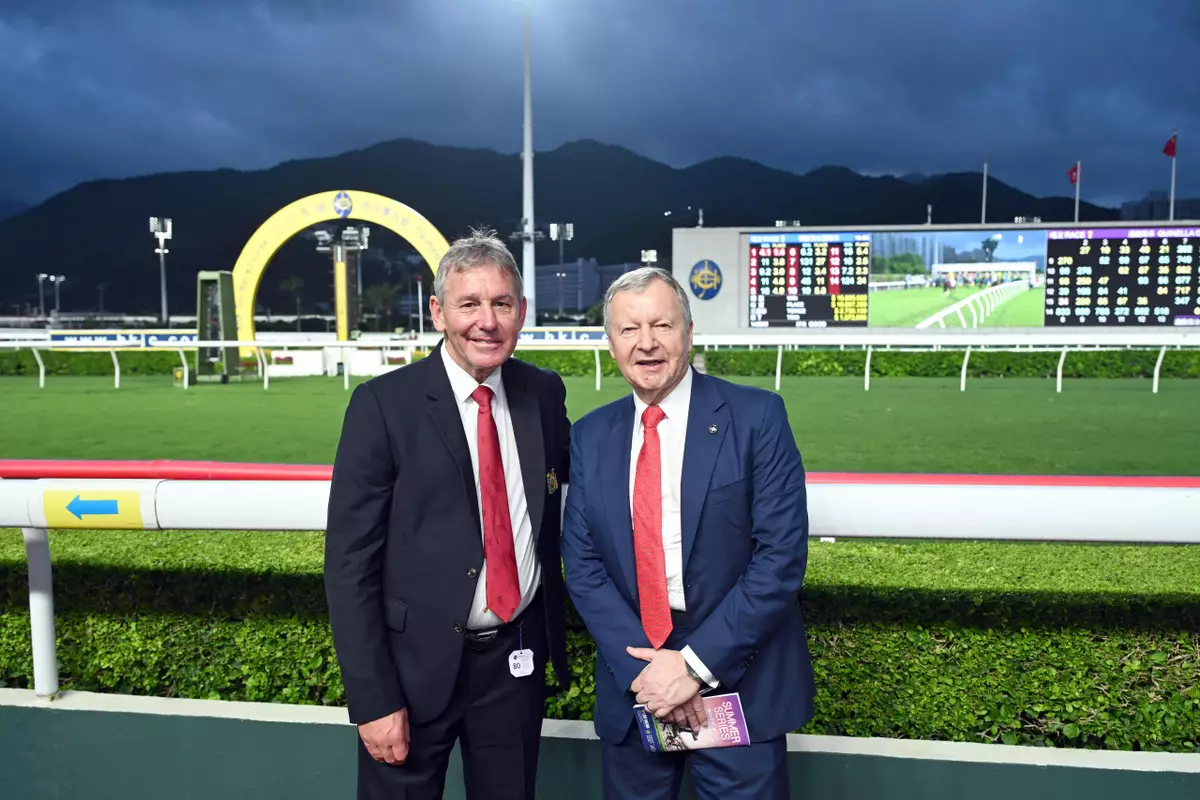 曼聯名宿白賴仁笠臣(Bryan Robson)(左)在馬會行政總裁應家柏(右)陪同下,在沙田馬場觀賞周六舉行的賽馬賽事。
