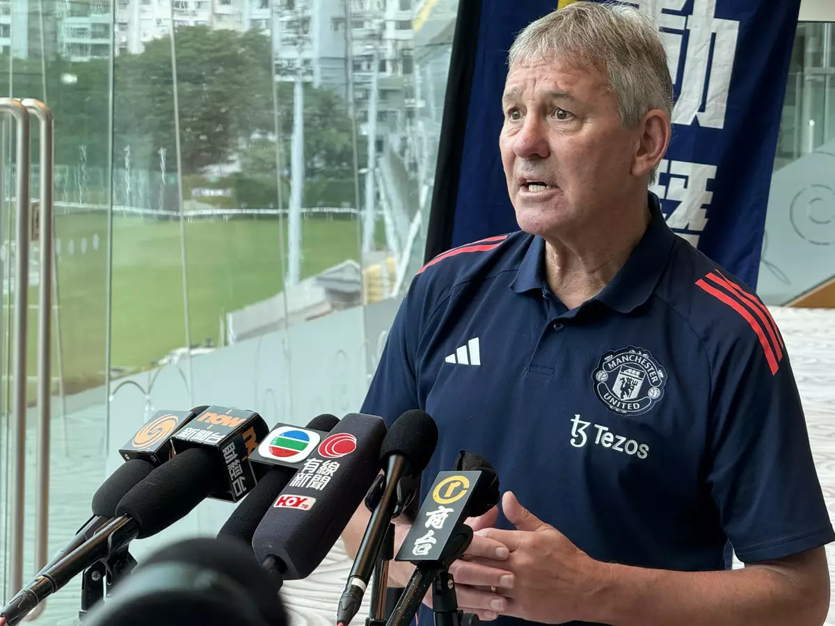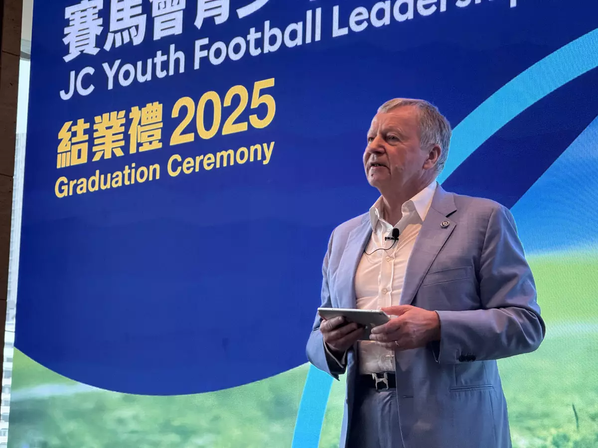 白賴仁笠臣(Bryan Robson)認為「賽馬會青少年足球領袖計劃」能夠有效幫助學員成為優秀領袖,又表示香港足球一直在進步,但強調不能自滿,要持續努力,才能與亞洲其他強隊競爭。 (巴士的報記者攝)