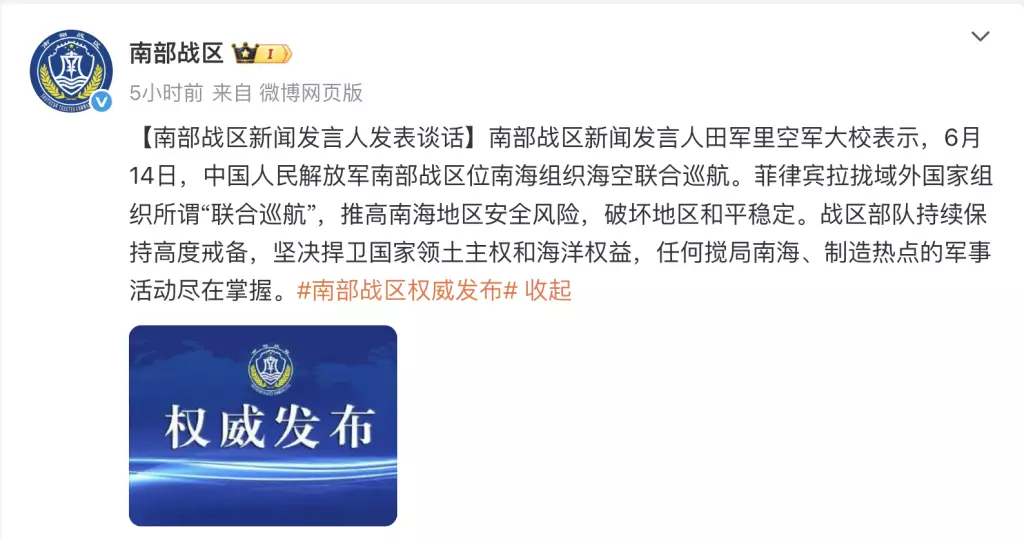 解放軍南部戰區新聞發言人表示,解放軍南部戰區星期六在南海組織海空聯合巡航。菲律賓拉攏域外國家組織所謂聯合巡航,推高南海地區安全風險,破壞地區和平穩定。戰區部隊持續保持高度戒備,堅決捍衛國家領土主權和海洋權益,任何攪局南海、製造熱點的軍事活動盡在掌握。