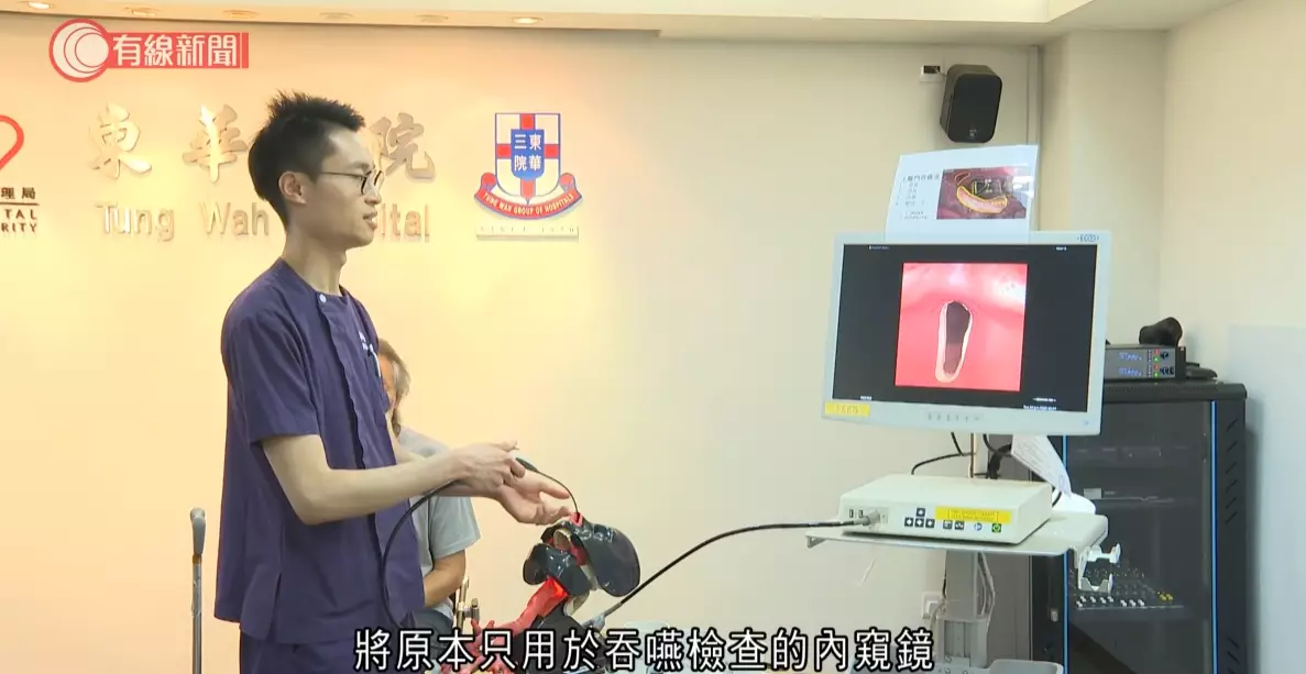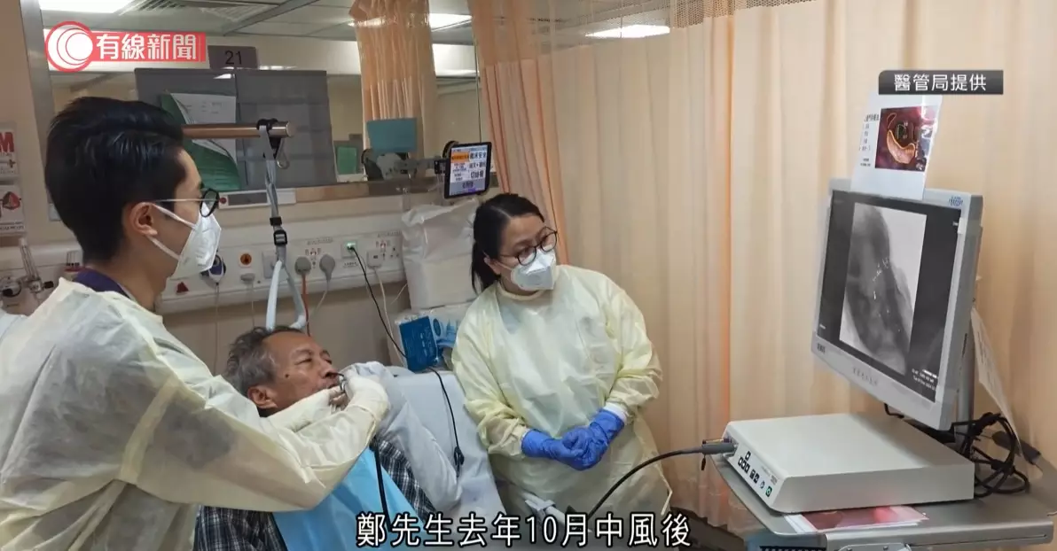 言語治療師為有吞嚥困難的病人,留在原來的病床做內窺鏡檢查評估,同時讓病人從電腦螢幕,看到自己吞嚥時肌肉活動的情況,從旁解說。有線新聞影片截圖