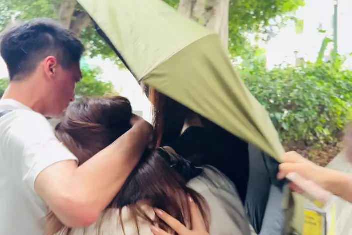 女被告潘巧賢在友人掩護下登車離開法院。巴士的報記者攝