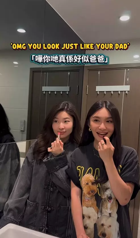 父親節(6月16日)不少藝人分享溫馨時刻,關禮傑女兒關楓馨與許紹雄女兒許惠菁一齊起「變臉」遊戲!兩位星二代在洗手間化妝照鏡影片,將自己「變身」成爸爸模樣,關楓馨更搞笑留言:「當好多人成日話你好似daddy...我哋真係有咁似咩?!」影片中可見,兩人對着鏡子後,五官神態竟與爸爸如出一轍,令網民直呼:「根本係父女複製人!」