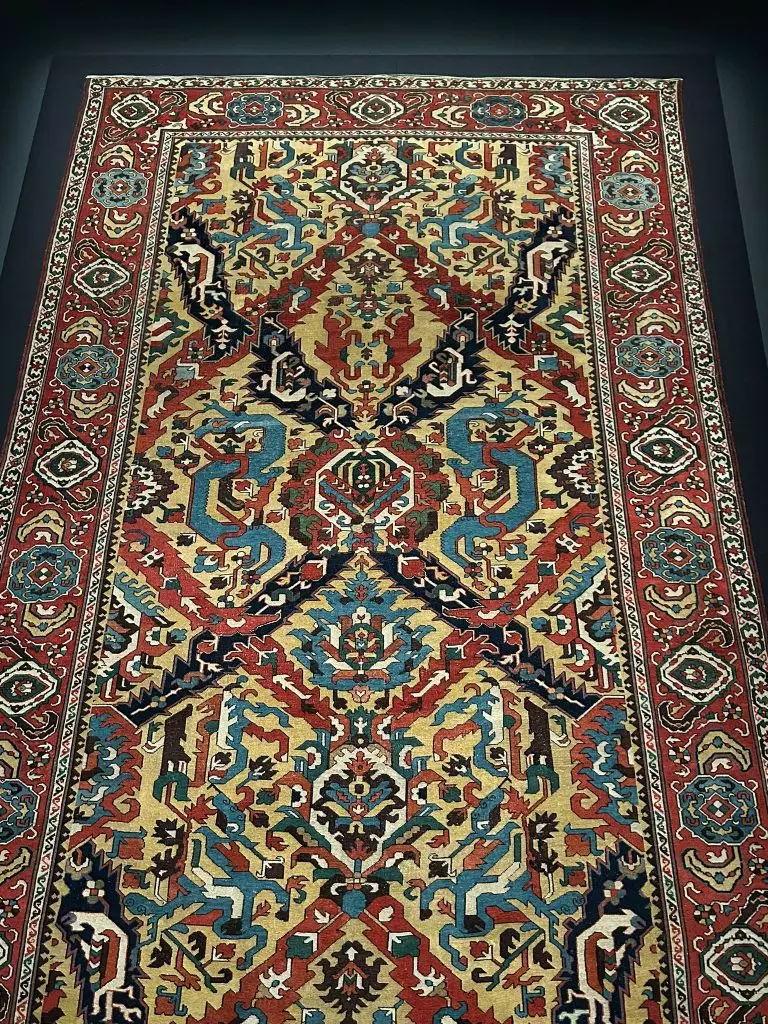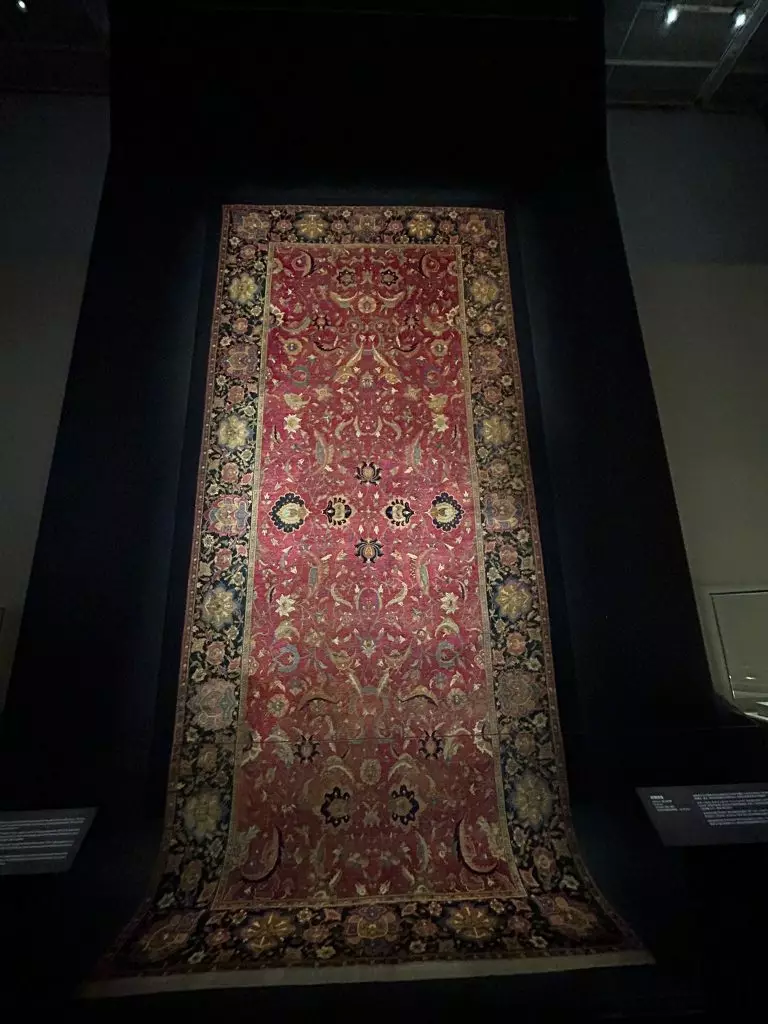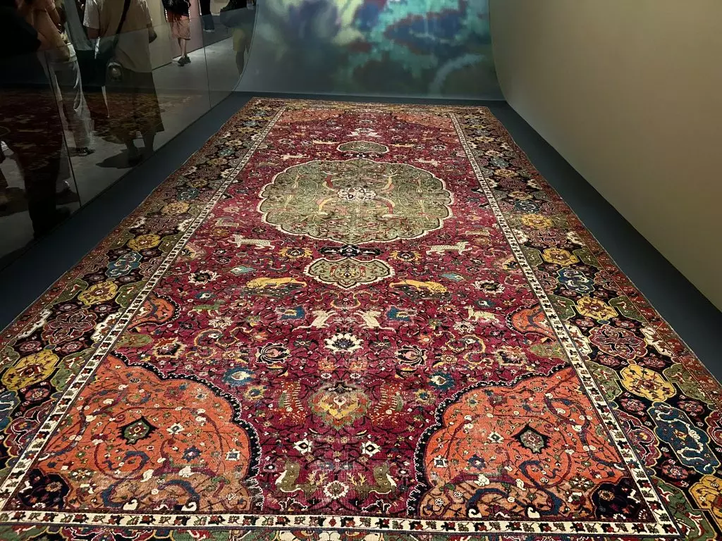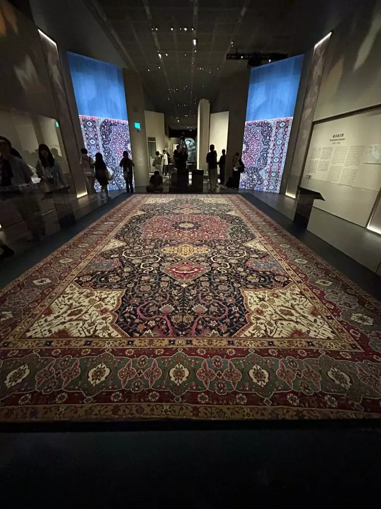 「天方奇毯」展出 15 幅巧奪天工的地毯珍品,包括長度接近十六米、現存全球博物館收藏最長伊斯蘭地毯之一的凱沃爾基安海得拉巴地毯,以及薩法維王朝蘇萊曼沙阿一世「打獵」圖地毯、如意寶珠禮拜毯等。中國國家一級文物花瓣紋栽絨地毯也將展出。