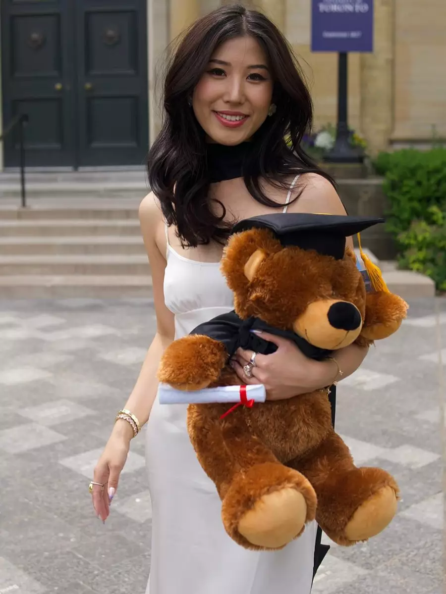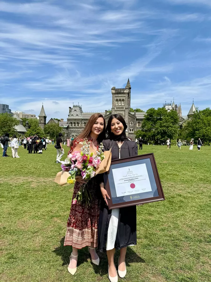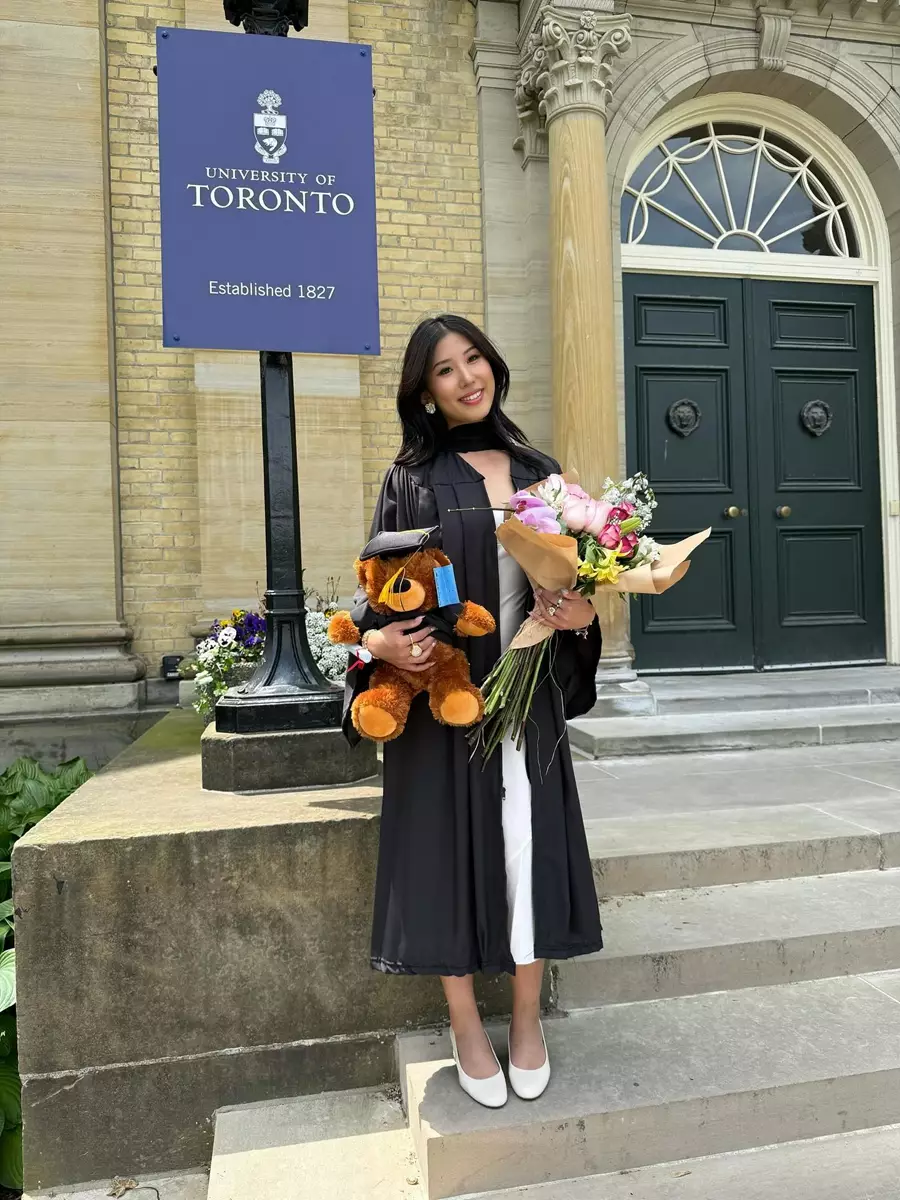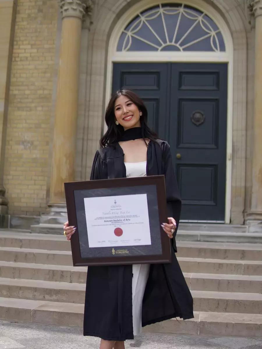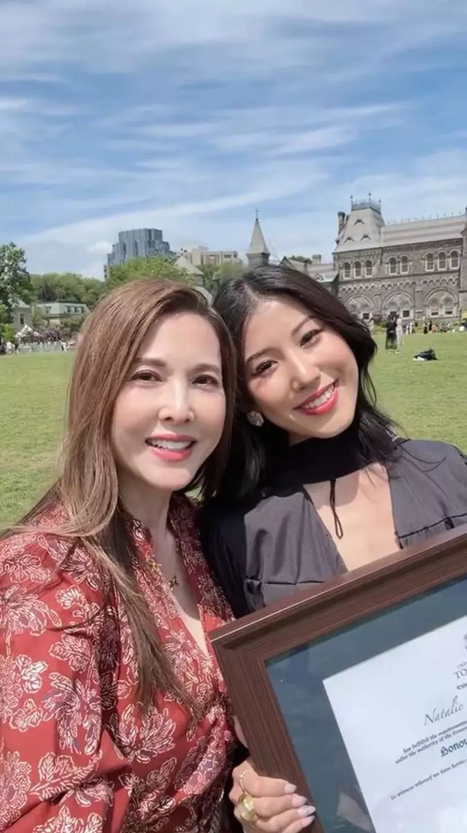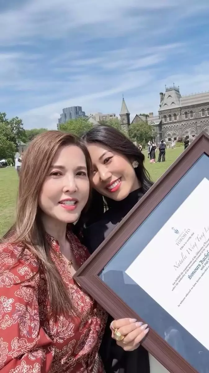 李婉華在IG分享出席Natalie於多倫多大學畢業的照片及影片,可見李婉華以一身紅裙到賀,與穿著畢業袍、拿着畢業證書的Natalie一同在校園到處打卡留念,並為囡囡感到驕傲,「衷心恭喜我囡囡Natalie以Honours bachelor with High Distinction高等榮譽成績畢業!你多年的努力沒有白費,你的堅持與毅力我好佩服!媽媽以你為榮!Proud mom moment!」