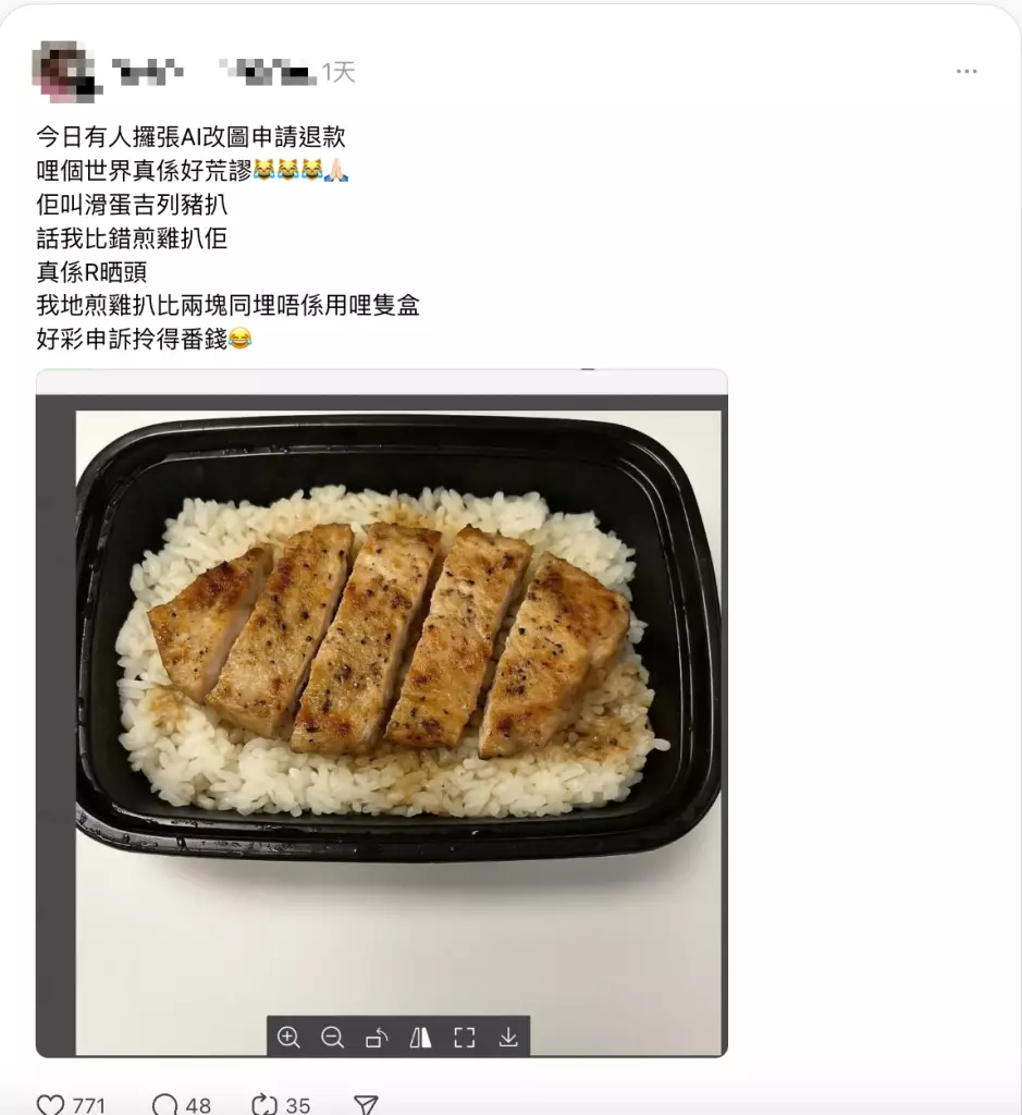 事主指,早前在一外賣平台接獲客人退款申請。該客人稱原訂「滑蛋吉列豬扒飯」,然後最終收到的卻是「香煎雞扒飯」,該名客人還附上一張雞扒飯照片作證據。不過事主仔細檢查照片後發現多處疑點:「我哋煎雞扒向來提供兩塊,而且從未使用過圖片中的包裝盒。」她隨即向平台提出申訴,強調照片與實際出品「大相逕庭」,最終成功「拎得返錢」。