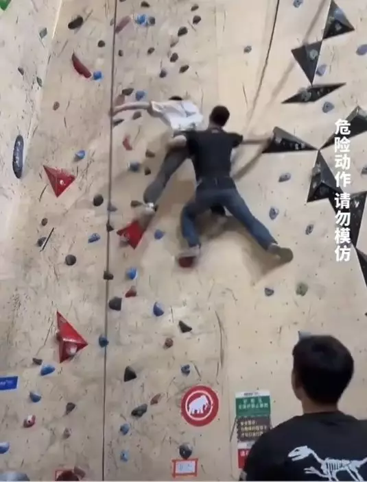 影片可見,男子在攀岩過程中逐漸失去體力,手腳開始打滑,最終從岩壁上滑落。正當他即將重重摔在地上的瞬間,旁邊一名正在攀岩的工作人員反應迅速,單手將男子穩穩抱住,緊接著一起降落至地面,成功阻止悲劇發生。