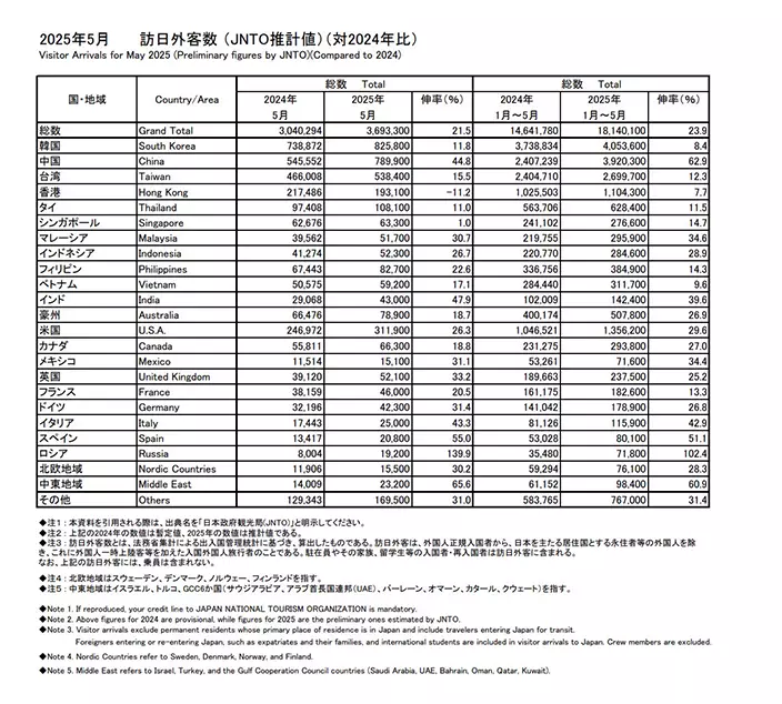 根據JNTO公佈的數據,2025年5月訪日外客總數達369.3萬人,按年升21.5%,刷新歷年同期紀錄。韓國、中國內地、台灣、美國等21個市場均創下單月新高,僅香港錄得雙位數跌幅。香港仍然是日本第四大客源地,但5月人數明顯減少,與區內其他市場形成強烈對比。