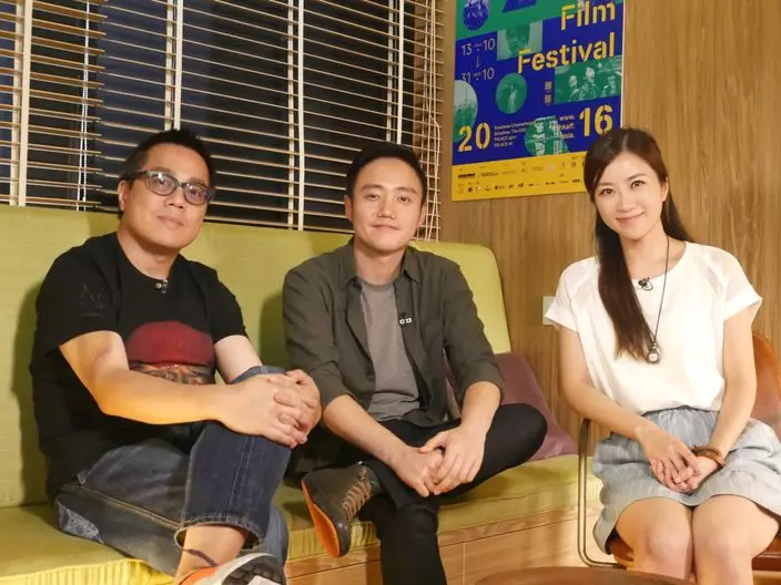 彭浩翔(左)及巫俊鋒(中)接受有線訪問,宣傳新片。