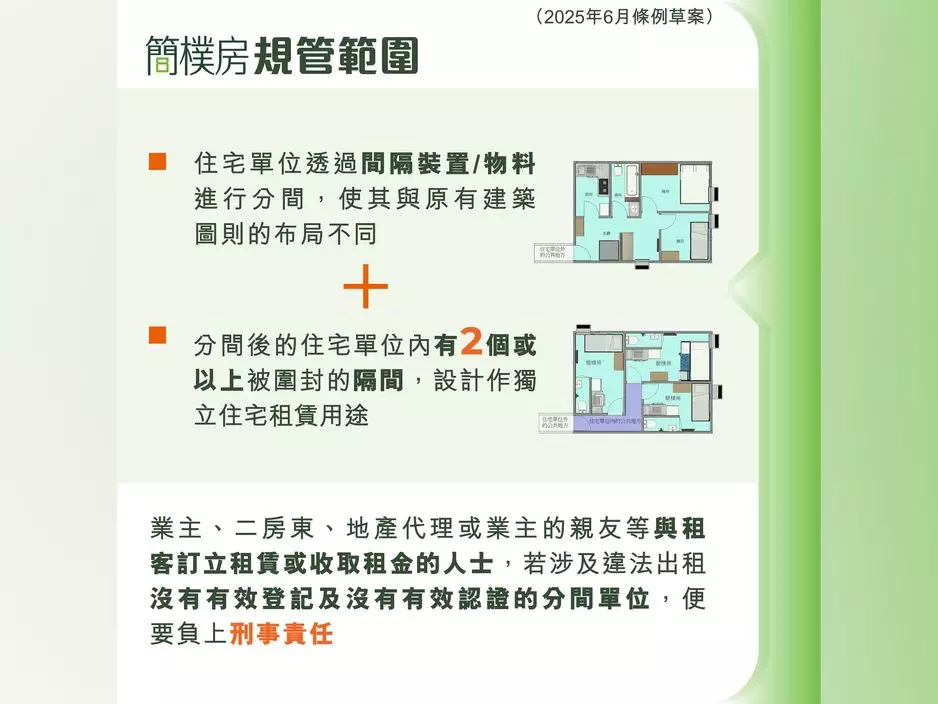 房屋局提出《簡樸房條例草案》,明年3月1日起,接受分間單位登記及「簡樸房」認證申請。有業主估計政策正式實施後,會有約一成不合規格的劏房被淘汰。