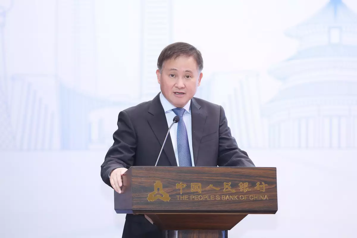 中國人民銀行行長潘功勝在北京舉行的「跨境支付通」啓動儀式上致辭。政府新聞處圖片