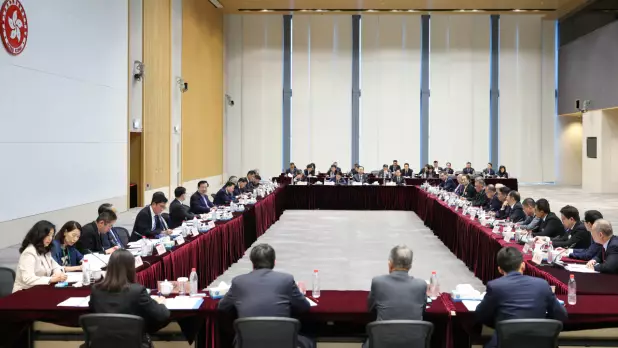 夏寶龍早上到政府總部與工商界會面,多名本港商會領袖及企業領導層出席。(港澳辦提供)