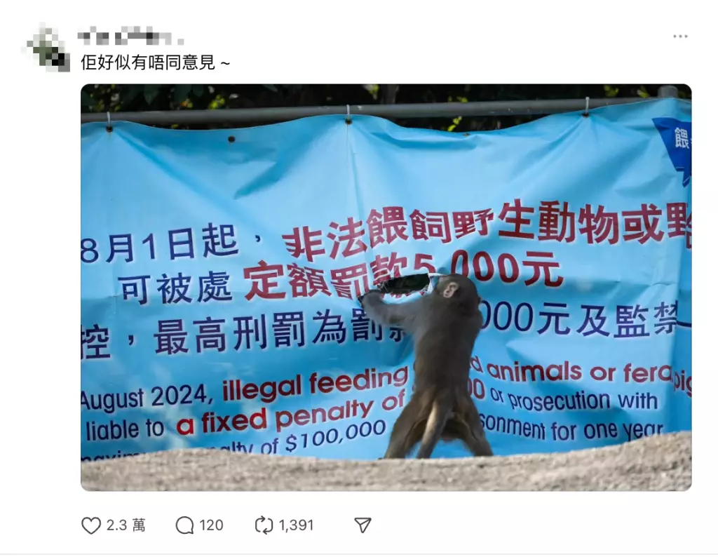 事主日前在社交平台以「佢好似有唔同意見 」為題發帖,上載一隻獨行馬騮仔正在撕毀禁餵野生動物的橫額。橫額中,「定額罰款5000元」的位置,剛好被扯開一個大咕窿。