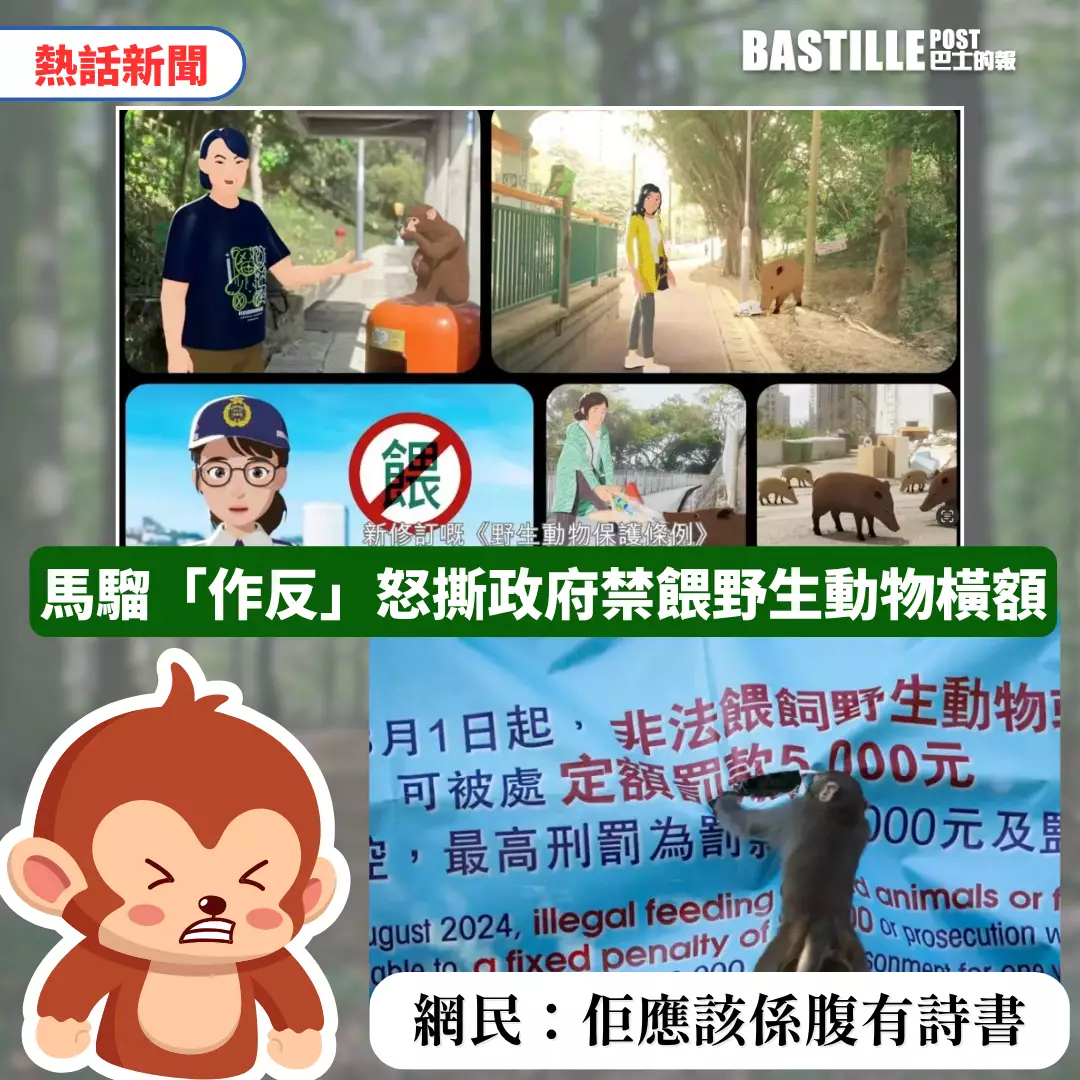 港府大力打擊非法餵飼野生動物,猴子作為直接「受害者」,近日被拍攝到懷疑遷怒宣傳品,怒撕禁餵野生動物橫額的作反一幕,有網民笑指這隻馬騮仔肚裏有點墨水,應該識字。