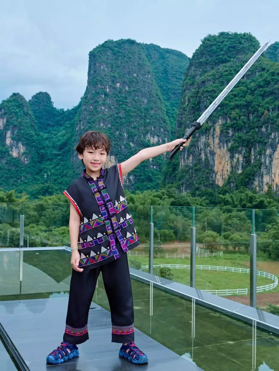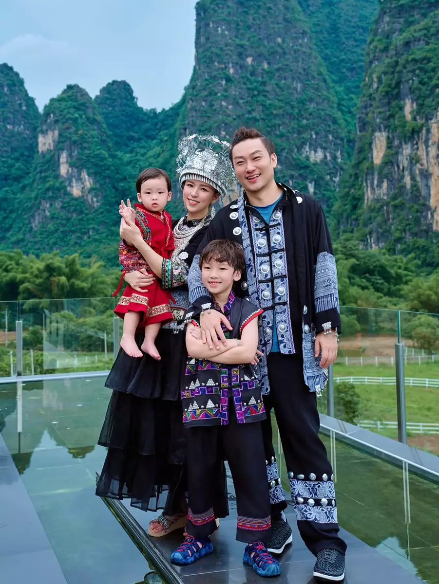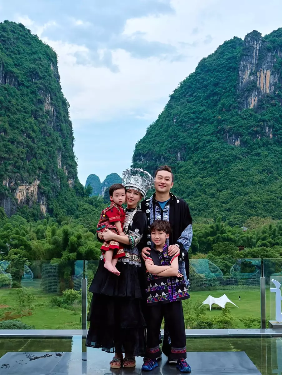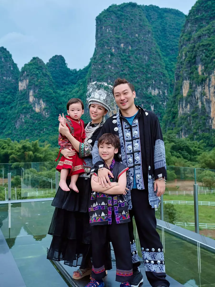 阿雪在社交平台分享多張旅行靚相,興奮寫道:「桂林山水甲天下~今次嚟到桂林真係見識到好靚嘅山水,仲影到咁有味道嘅全家福!」相中可見,阿雪一家四口齊齊換上民族服裝,在如畫山景前留下溫馨合照。雖然阿雪身穿暗色系服飾,但仍難掩其柔美氣質,而大仔Riley更單手高舉道具劍,擺出型仔姿勢,萌爆又搶鏡!