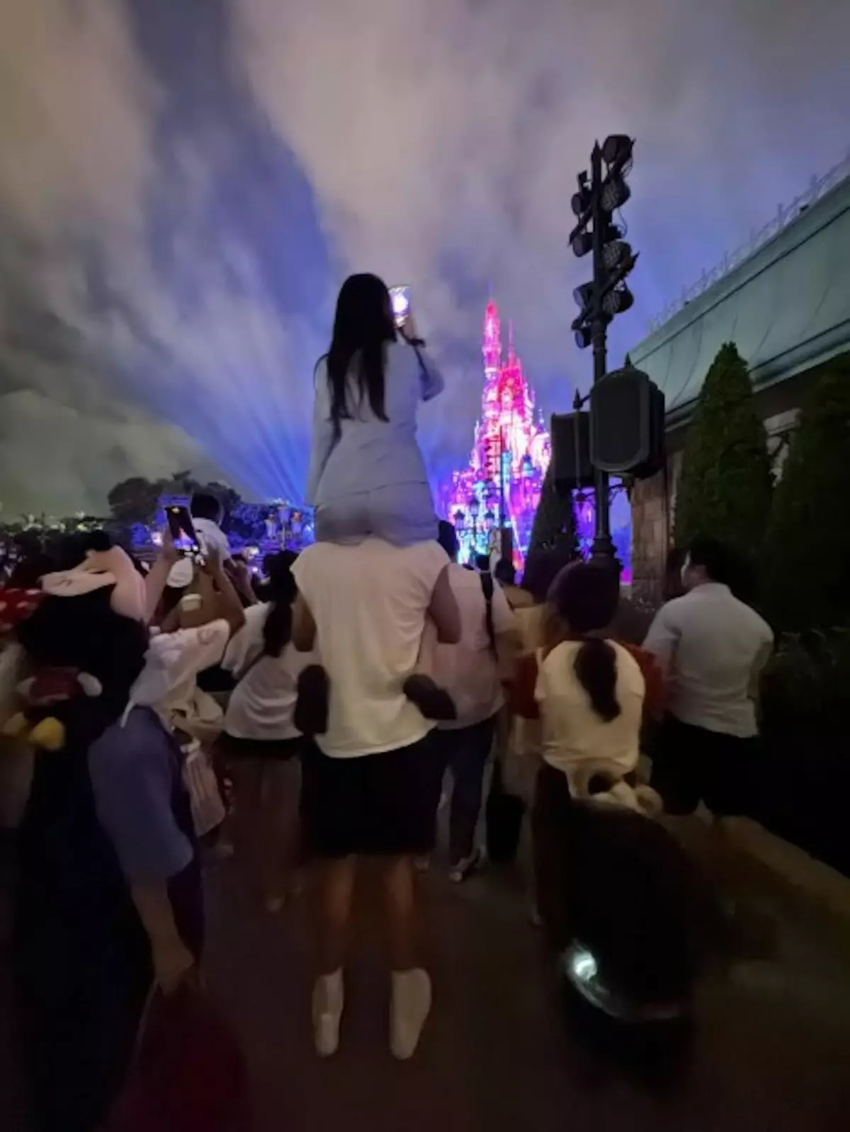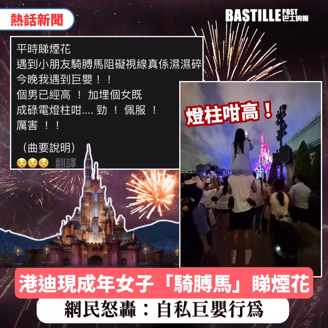 近日有網民在社交平台發文,公審1名成年女子為觀賞香港迪士尼樂園煙花匯演,竟以「騎膊馬」姿勢騎在男伴肩上。發帖者諷刺:「平時小朋友騎膊馬阻擋視線都算,今晚我竟然遇到個巨嬰!」