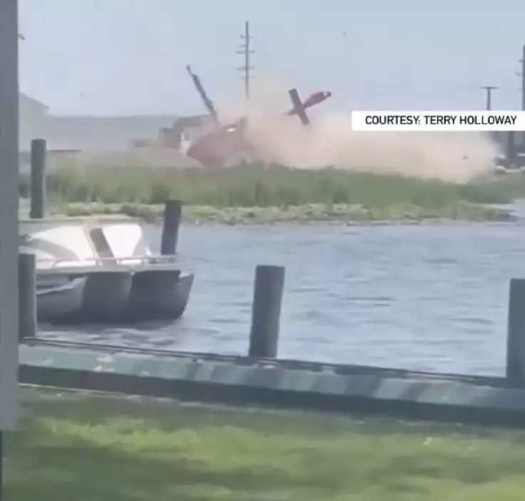 影片可見,直升機驟然向前傾斜並開始劇烈旋轉,當直升機接觸地面時,機身突然反彈並側翻,螺旋槳高速旋轉將大量塵土及碎片捲向餐廳方向,現場一度陷入混亂,附近旁觀者見狀驚叫連連,「天哪」。