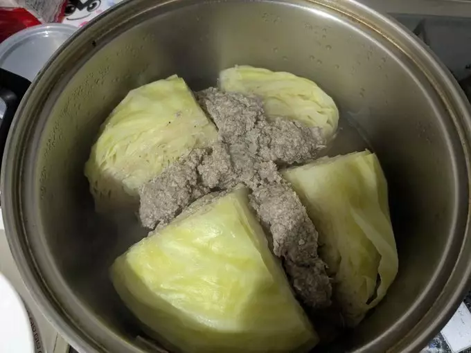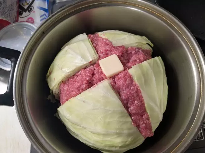 照片可見,帖主將整個椰菜切成十字型切口,再將肉類及牛油塞入其中,緊接著放入電飯煲以清燉方式煮熟,最後切片享用。