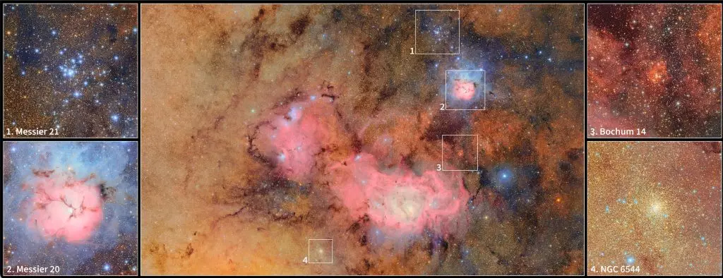 另一張合成圖像結合678張照片,展現人馬座方向的三裂星雲 (Trifid Nebula) 與礁湖星雲 (Lagoon Nebula),呈現難以觀測的氣體與塵埃細節,這些恆星誕生區域距地數千光年。