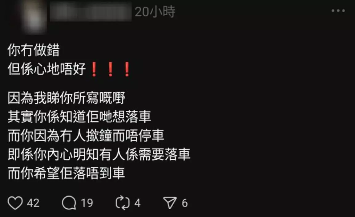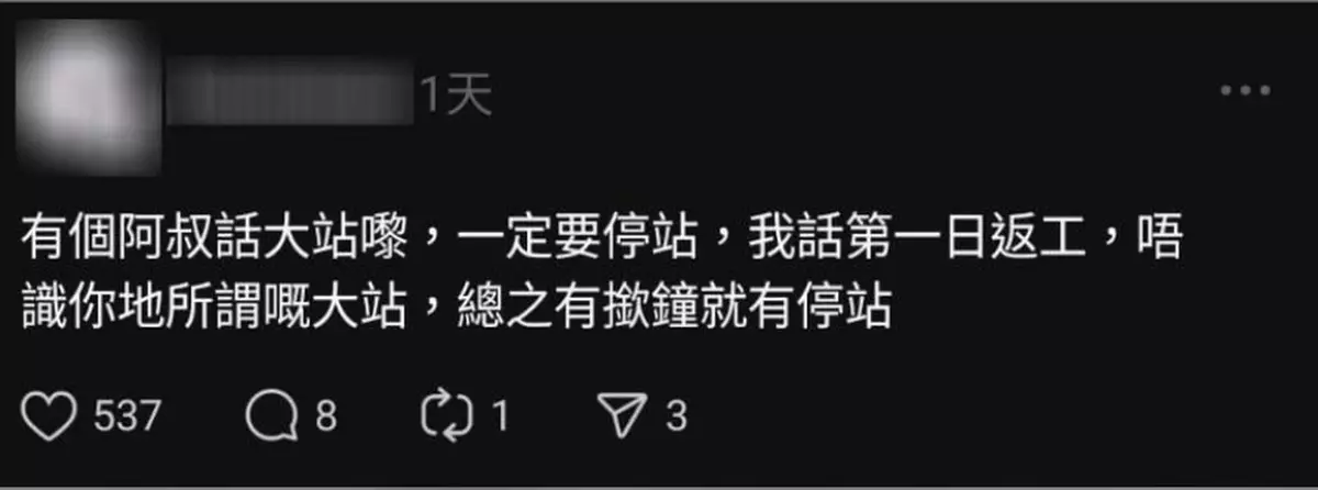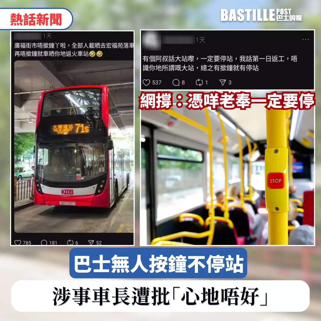 乘客搭巴士時,上車需遞手示意,下車則須按鐘,是一直已有的乘車習慣和禮儀。近日,一名相信是車長的網民在網上發文表示:「廣福街市唔撳鐘丫啦,全部人載晒去宏福苑落車,再唔撳鐘就車晒你哋返火車站。」言論引起網民批評。