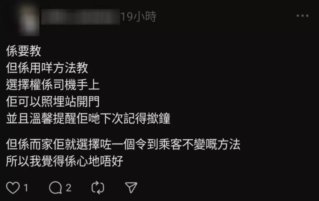 有網民就指出乘客只要做多一步,都可以避免同類情況,「其實有其他人撳既(嘅)話,車門頂、車頭都會著紅燈,望多一眼都難?」另有人指出,乘客忘記按鐘與「以為有人撳於是自己唔撳」是兩回事,坦言「停畀你係人情,唔好係(喺)度情(緒)勒(索)」。