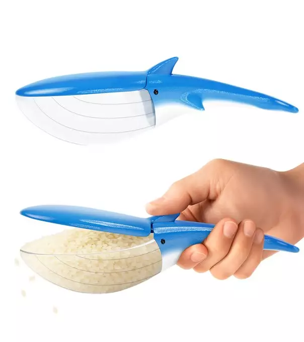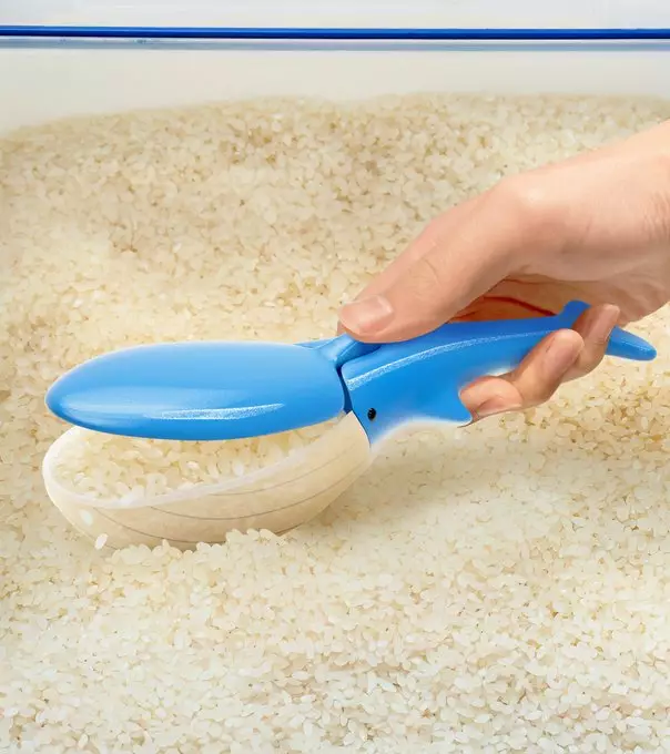 照片可見,舀米杓以鮮藍色為主調,整體造型模仿座頭鯨的流線輪廓,鯨魚寬大的口部化身為主要盛米容器。透明的鯨口部分設有刻度線,方便精確量度,每次可盛裝一杯米量,令備料過程更準確。使用時只需輕舀即倒,不但操作方便,視覺上更予人療癒感覺,彷彿與大海精靈共同準備膳食般。