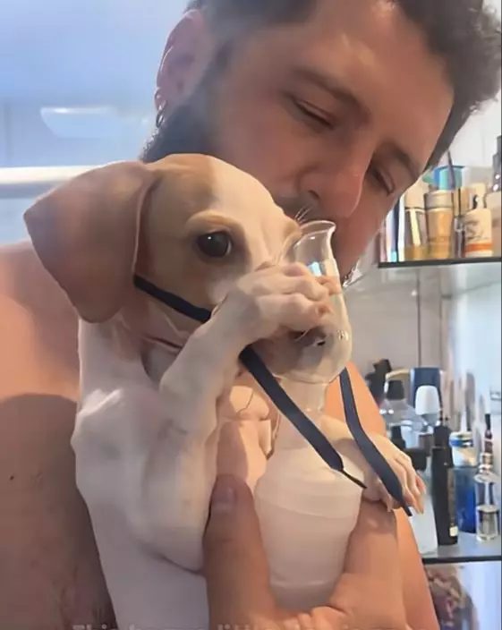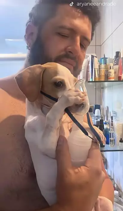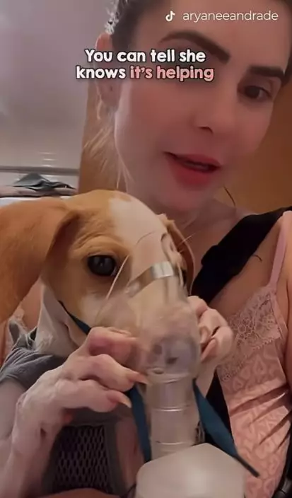 巴西夫婦暖心收編病重流浪犬陪做霧化治療。影片截圖