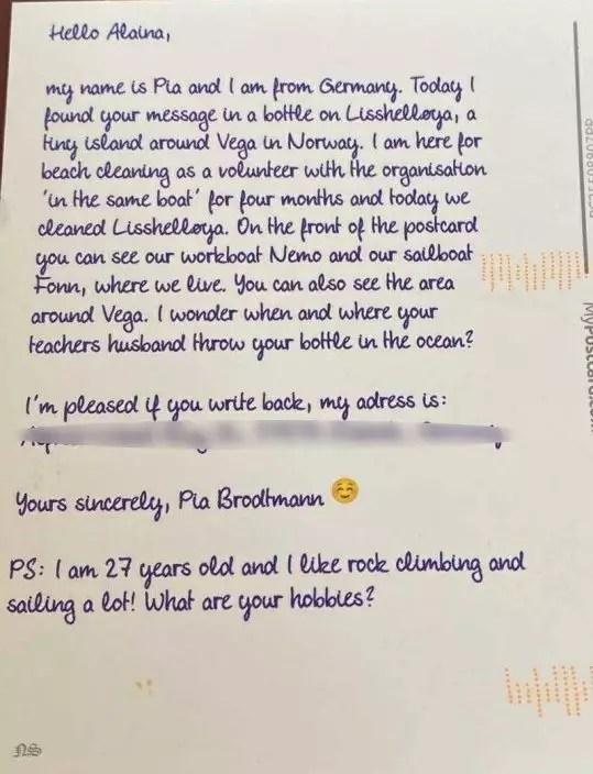經過31年的漂流,「瓶中信」於近日在挪威維加(Vega)附近小島Lisshelløya被一名27歲的德國義工Pia Brodtmann發現。當時,Pia正參與當地海灘清理行動,發現這個外觀陳舊但信紙仍可清晰分辨的「瓶中信」後,遂按信上地址向Alaina寄出明信片。她在信中寫道:「我是來自德國的Pia,今天在Lisshelløya島上發現了妳的瓶中信。我是『In the same boat』組織的義工,在這裡進行為期4個月的海灘清理」,並附上作業船與生活帆船的照片,分享自己熱愛攀岩與航海的生活點滴。