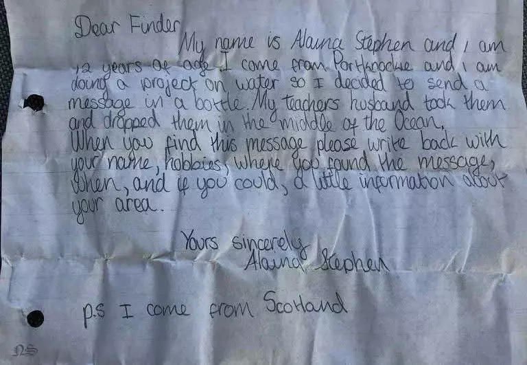 綜合外媒報導,英國蘇格蘭莫雷郡(Moray)小鎮一名女子Alaina Beresford於1994年僅12歲時,為了學校水資源專題製作,在老師安排下將一封手寫信件放入Moray Cup汽水瓶內並投入大海。她在信中進行簡單自我介紹及註明是課堂功課,請拾獲瓶中信的人士回信告知姓名、愛好、發現地點及所在地情況。