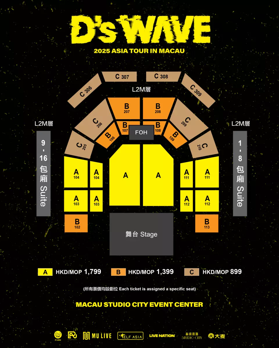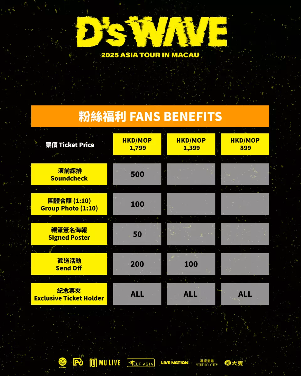 《DAESUNG 2025 ASIA TOUR: D's WAVE IN MACAU》門票將於7月8日上午11時起公開發售,公開發售平台包括:Studio City (https://www.studiocity-macau.com)及Damai (https://www.damai.cn/) 。門票售價為港幣/澳門幣 1,799、1,399、899(全坐位),粉絲福利包括「演前綵排」、「團體合照 (10 人小組)」、「親筆簽名海報」、「歡送活動」及「紀念票夾」等,讓大家可以更近距離見到大聲。 有關粉絲福利的詳細安排,日後將於ELF ASIA Instagram公佈,敬請留意。