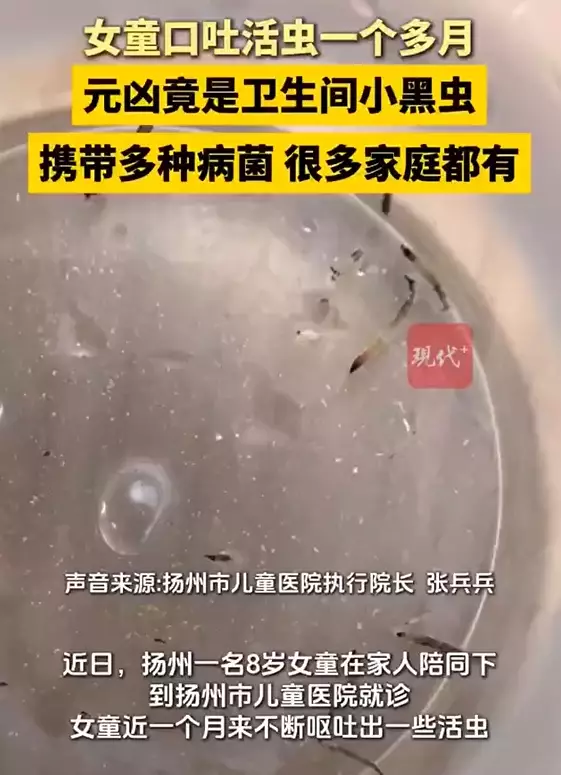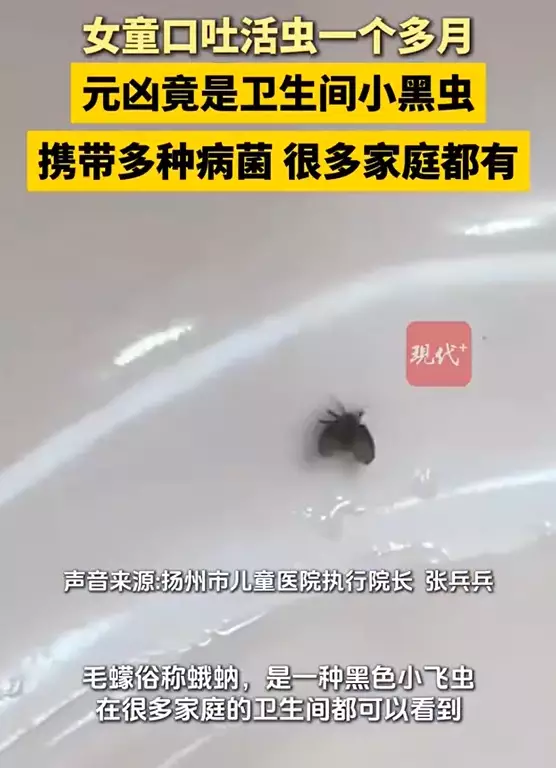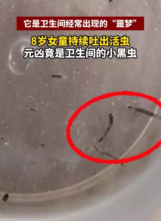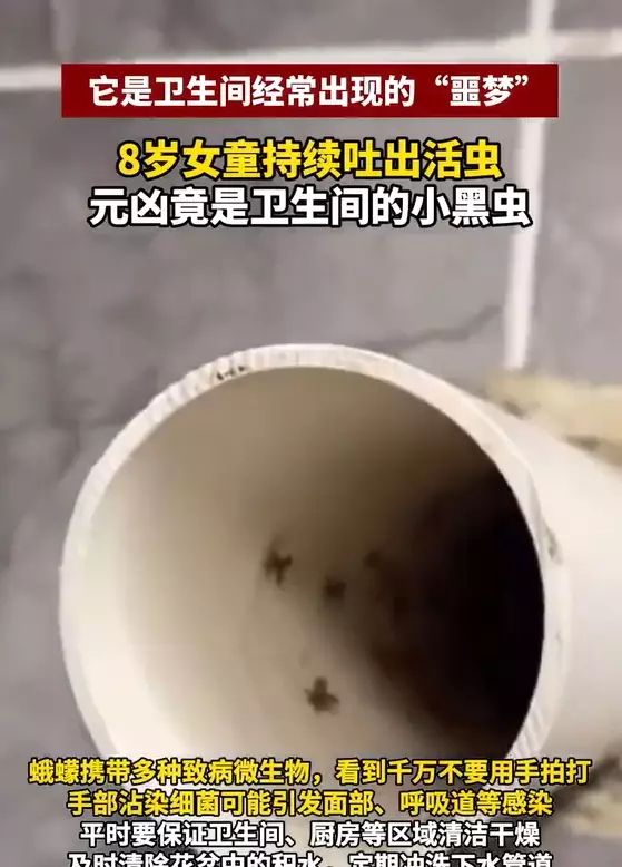 內地江蘇省揚州市一名8歲女童連續一個多月從口中吐出活蟲,輾轉求醫後確認禍首竟為家中衛浴常見的黑色小飛蛾「蛾蚋」幼蟲。疾控人員提醒,梅雨季節需加強家居排水管道清潔,避免類似情況發生。