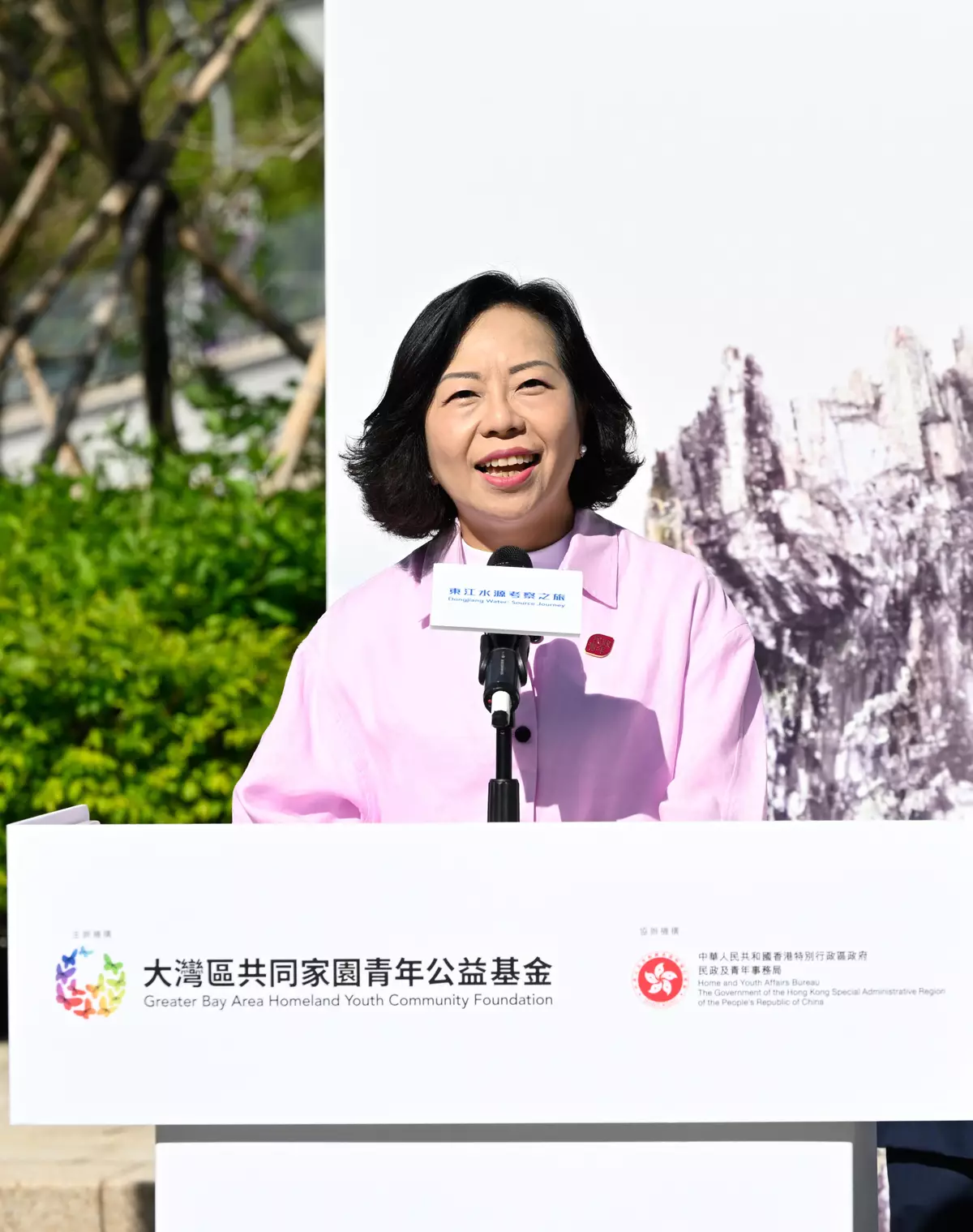 民政及青年事務局局長麥美娟女士致辭時表示:「六十年來,東江水一直滋潤著這座城市的每一個角落,充分體現了國家對香港的深切關愛。今日,我懷著無比喜悅的心情,見證近600位青年朋友在高鐵站整裝待發,參加由大灣區共同家園青年公益基金主辦、民青局協辦的「東江水源考察之旅」。項目讓青年人了解東江供水工程的建設歷史、管理保護及沿途人文歷史等情況。」