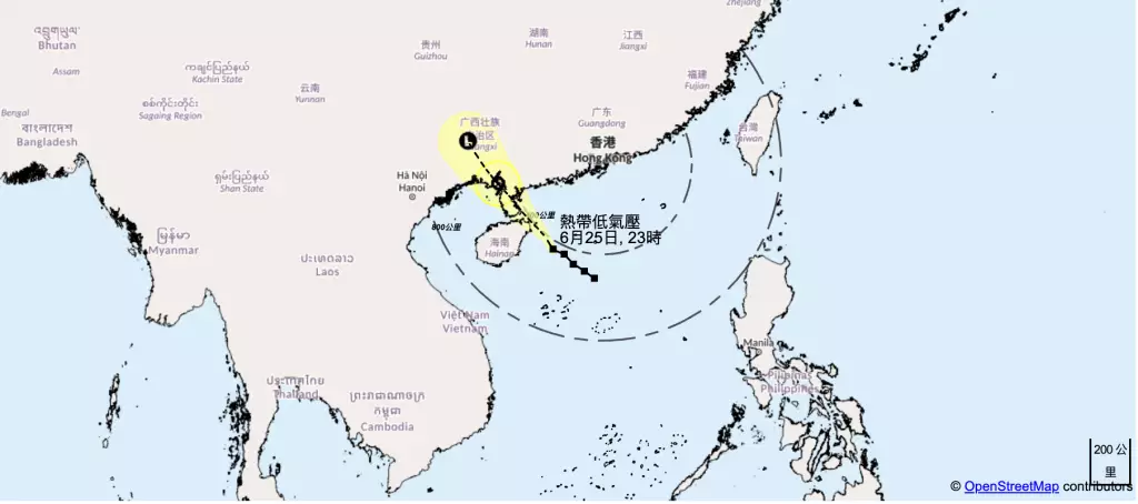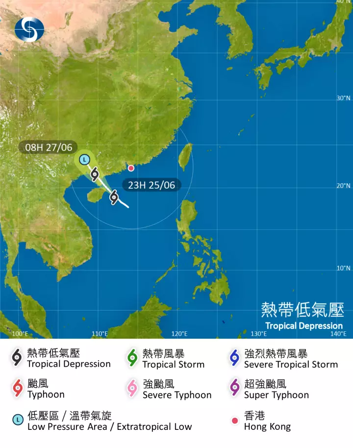 天文台表示,位於南海北部的熱帶低氣壓集結在香港西南偏南約440公里,預計星期四早上在本港西南約400公里左右掠過,隨後登陸雷州半島。除非該熱帶低氣壓採取較接近珠江口的路徑或顯著增強,否則本港普遍地區持續吹強風的機會較低,1號戒備信號會在星期四早上維持。
